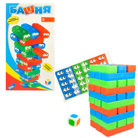 Настільна гра "Вежа".У наборі 30 брусків різних кольорів (по 10 штук трьох кольорів) та кубик.. Бруски викладаються горизонтально, по три штуки в ряд, чергуючись у двох напрямках – ряд вздовж, ряд упоперек. Необхідно витягнути брусочок знизу або середини вежі та встановити його зверху, не обрушивши будову. Бруски потрібно укладати по одному кожного кольору в ряд. Кидаючи кубик, гравцеві випадає колір бруска, який він має витягнути. Програє той, на чиєму ході вежа впаде.Характеристики