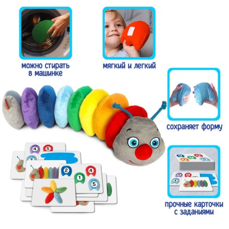 Мягкая развивающая игрушка "Гусеница". Состоит из 9 деталей (голова и 8 частей туловища), которые скреплены липучкой и могут отсоединиться друг от друга. Длинна гусеницы - 57 см. Выполнена из качественных и безопасных материалов.Бренд: Масік