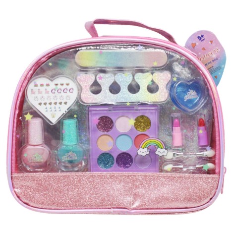 Набор косметики в блестящей сумочке-косметичке обязательно порадует маленькую принцессу. В комплект входит палетка теней на 9 цветов, 2 аппликатора, 2 помадки, блеск для губ, разделитель пальцев для педикюра, два блеска для ногтей и наклейки для маникюра. Размер сумочки: 24х20х2.5 см.__Бренд: Zyra toys